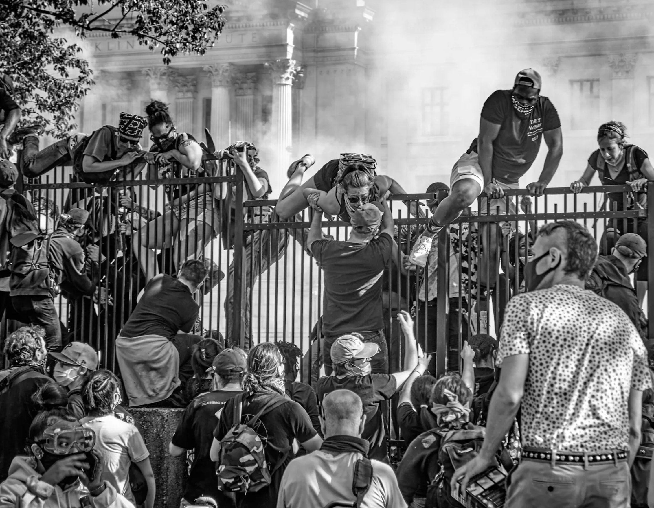 In May 2020, protests erupted around the country in response to the murder of George Floyd, a Black man, by the hands of a White policeman in Minneapolis. People took to the Parkway to express their anger and demand change. In this photo, protestors climb over the I-676 fence next to The Franklin Institute.